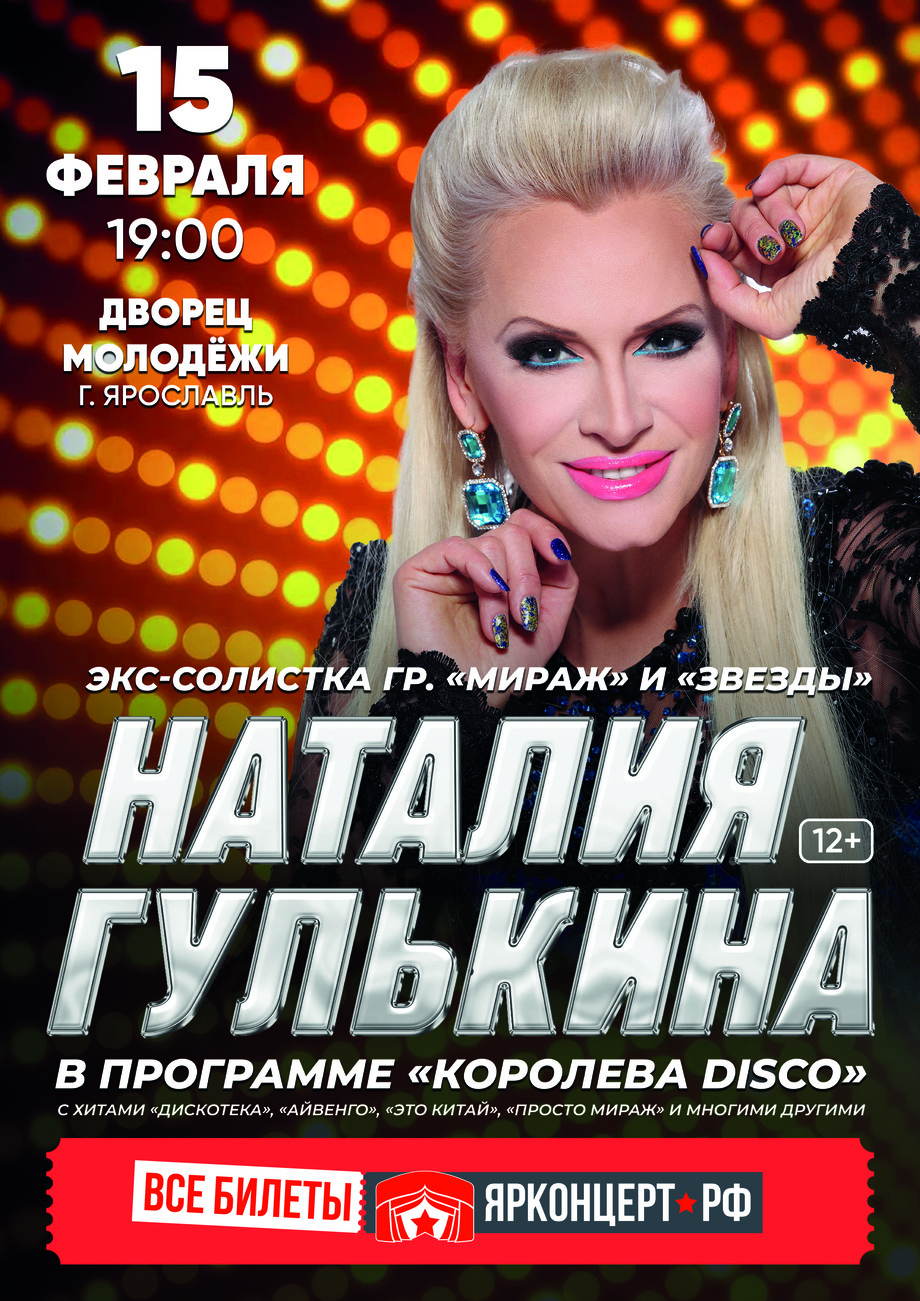 Концерты королевы диско Наталии Гулькиной - яркое динамичное зрелище в сопровождении высококлассного шоу-балета. Стоит только вспомнить строчку из знаменитого хита "Ты прекрасней всех, пусть мерцает свет, пусть горят огни наших дискотек", и ноги сами пускаются в пляс! Ждем вас 15 февраля в Дворце Молодежи.